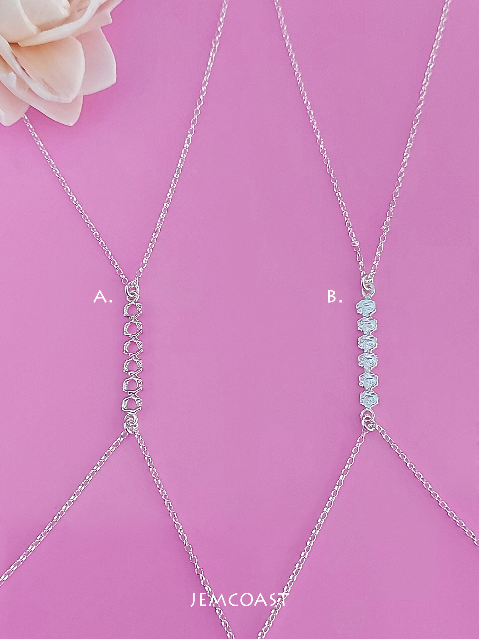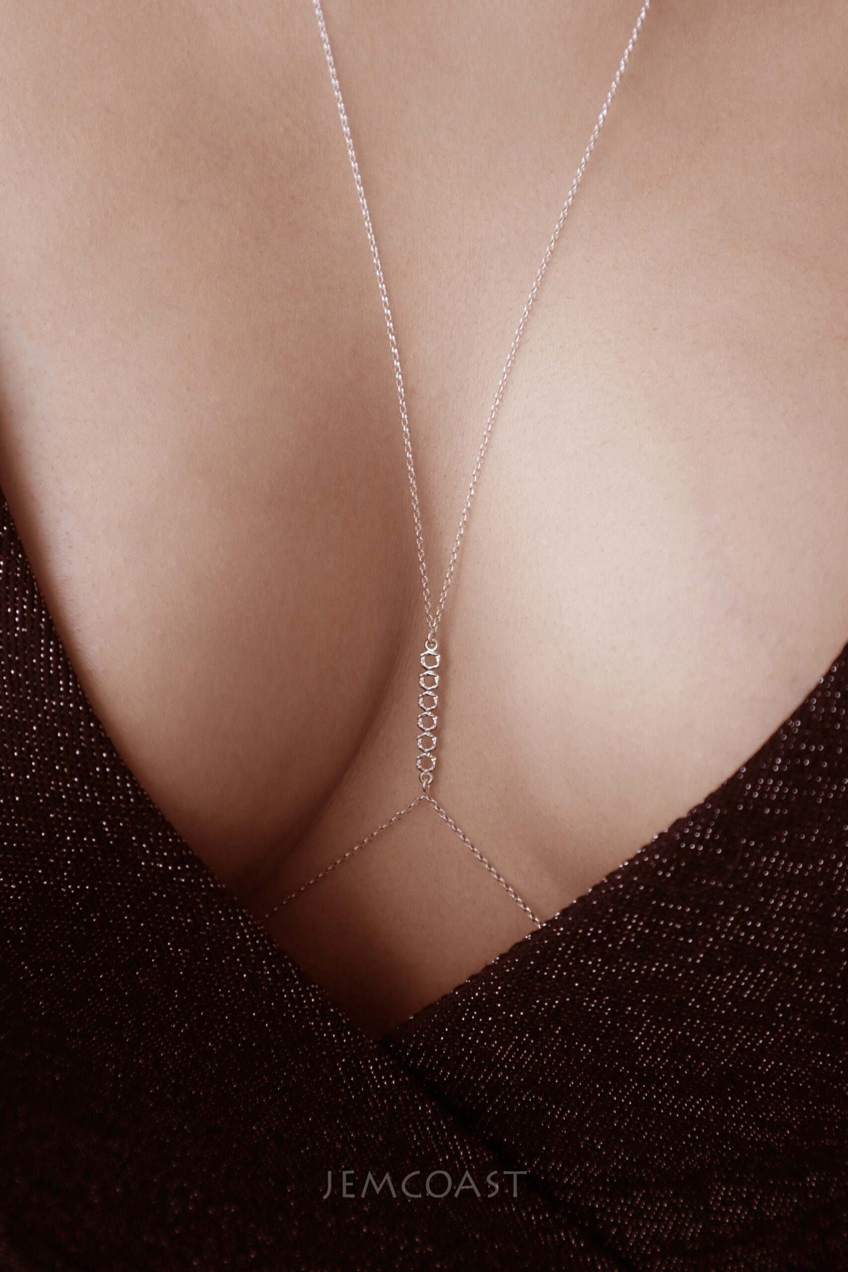 Layered Body necklace made of Shiny Sterling Silver super thin dainty chain. Perfect body jewelry for 12 months of the year: You can wear it as a long necklace with deep V tanks or dresses, or as a bikini body jewelry. It has 2 closures, the one is on the neck and the other on waist. Check the dimensions, the size is about S-M. For bigger custom sizes contact us!